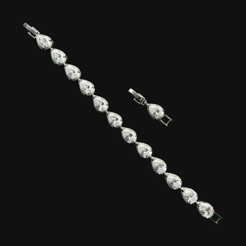 NØVRA's Drop bracelets never disappoint. Their unique design is the perfect addition for any outfit featuring shining pear cut stones, balanced weight, and a polished finish making it effortless to wear. A folding clasp with an extension piece creates a one size fits all design.
